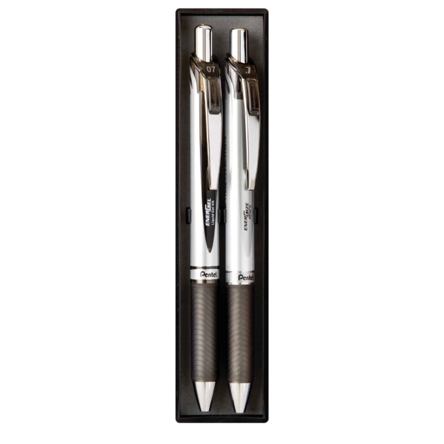 The EnerGel gift set includes 1 EnerGize Deluxe mechanical pencil and 1 EnerGel RTX gel pen. Pen and ink color is black with a silver barrel for 1 or 2 color imprint. Hi-performance liquid gel ink dries so fast even left-handed writers love it – no smears! Pencil is pre-loaded with 0.7mm Super Hi-Polymer Lead. Prices include a one color imprint on pen & pencil inserted into gift box.